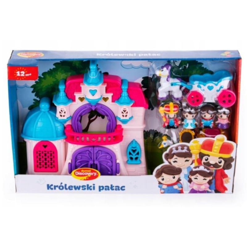 Wejdź do bajkowego królestwa, pełnego zaczarowanych elementów! Razem z zestawem figurek baw się w odgrywanie ról, rozwijając przy tym wyobraźnię i kreatywność. Poza okazałym pałacem, znajdziesz tu jego mieszkańców (króla, królową, królewnę i królewicza), karetę, łabędzia, na którego skrzydłach możesz przewozić figurki, oraz akcesoria przydatne podczas zabawy: tron i lustro. Na górze pałacu znajduje się przycisk w kształcie serduszka, który uruchamia światełko i uroczą melodię.