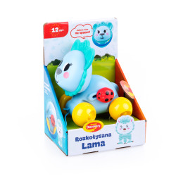 Lama na sznureczku to wymarzony kompan do zabawy. Kiedy maluch prowadzi rączką zwierzaka, ten jedzie, zabawnie kołysząc przy tym głową na boki. Lama wyposażona jest w cztery kółeczka o nieregularnym kształcie, co zapewnia ciekawy efekt wizualny. Dodatkowo, można je rozpędzić, aby postawiony na podłodze zwierzak pojechał samodzielnie do przodu. Na boku lamy siedzi biedroneczka, która przy przesuwaniu wydaje terkoczący odgłos.