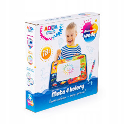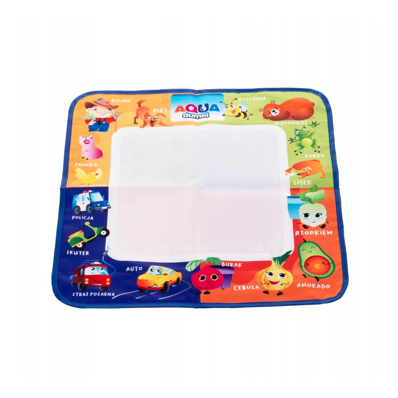 Mata do malowania podzielona jest na 4 pola kolorystyczne, co umożliwia tworzenie barwnych rysunków. Jej krawędź ozdobiona jest wesołymi, obrazkami oraz ich nazwami, dzięki czemu dzieci mogą poznawać nowe wyrazy. W zestawie znajduje się specjalny mazak, który, po napełnieniu wodą, będzie malował po macie. Kiedy mata wyschnie, obrazek zniknie, jak zaczarowany!