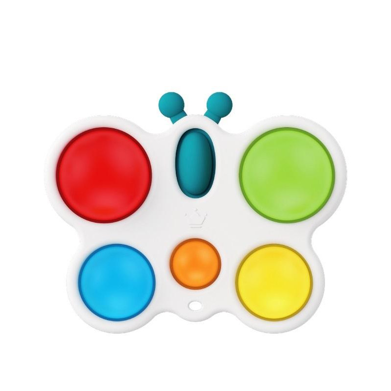 Motylek zrelaksuje malucha zabawą w klikanie! Ta zajmująca czynność stanowi świetną rozrywkę, która dodatkowo pomaga ćwiczyć paluszki. Motylek posiada jedno owalne i pięć okrągłych, kolorowych pól. Zadaniem najmłodszych jest przepchnąć wszystkie wypukłe elementy na drugą stronę zabawki. Czynności tej towarzyszyć będzie zabawny odgłos klikania. Po zabawie z jednej strony motylka i uporanie się z zadaniem, można go odwrócić na drugą stronę, aby rozpocząć zabawę od nowa.