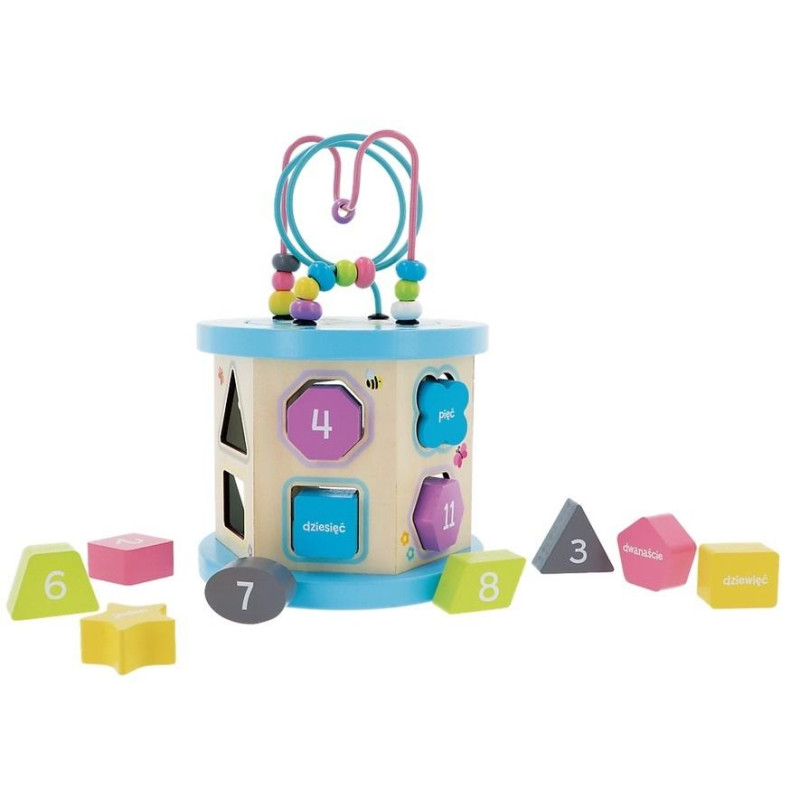 Wielofunkcyjna zabawka ogólnorozwojowa do nauki kształtów, kolorów oraz cyfr. Sorter angażuje dziecko do nauki poprzez zabawę idealne rozwiązanie dla dzieci od 18 mż.Dopasowywanie kształtów do otworów, przesuwanie koralików po torze oraz nawlekanie klocków na sznureczek wspomagają rozwój zdolności manipulacyjnych małych rączek. Klocki nadrukowane są dwustronnie z jednej strony liczba, z drugiej odpowiadający jej zapis słowny. Zabawka wzmacnia koordynację wzrokowo-ruchową dziecka, jednocześnie rozwijając umiejętność logicznego myślenia i koncentracji. Na odwrotnej stronie sortera znajduje się prosta gra planszowa .Wszystkie materiały wykorzystane do stworzenia zabawki posiadają atesty, a także zostały pomalowane nietoksycznymi farbami.