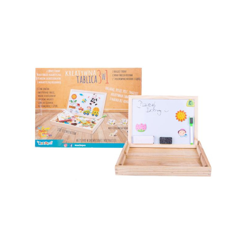 Edukacyjna zabawka, tablica 3w1, zapakowana w drewnianą skrzynkę. Zestaw składa się ze 100 elementów. Z jednej strony biała tablica magnetyczna z pisakiem suchościeralnym i magnetyczną układanką. Z drugiej strony czarna tablica kredowa z 3 kolorami kredy i gąbką.