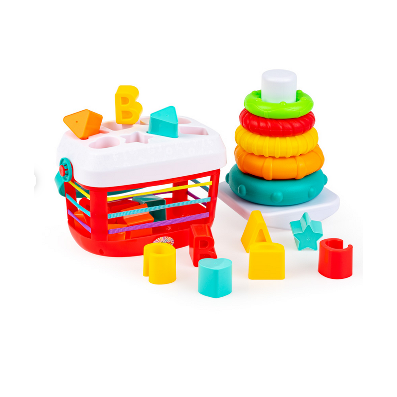 Super sorter w formie koszyczka, może pomieścić aż 16 klocków w różnych kształtach. Po dopasowaniu elementów do otworów i umieszczeniu ich we wnętrzu koszyczka, wystarczy wyciągną je na zewnątrz, przez elastyczne, sznurkowe ścianki i już zabawę można rozpocząć od początku! Poza koszyczkiem, znajduje się tu też piramidka z pięcioma obręczami, różniącymi się nie tylko rozmiarem, ale też fakturą i kolorem. Zadaniem malucha jest odpowiednio ułożyć obręcze od największej do najmniejszej, aby stworzyć z nich kompletną piramidkę.