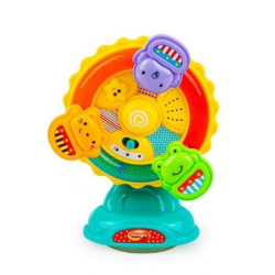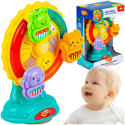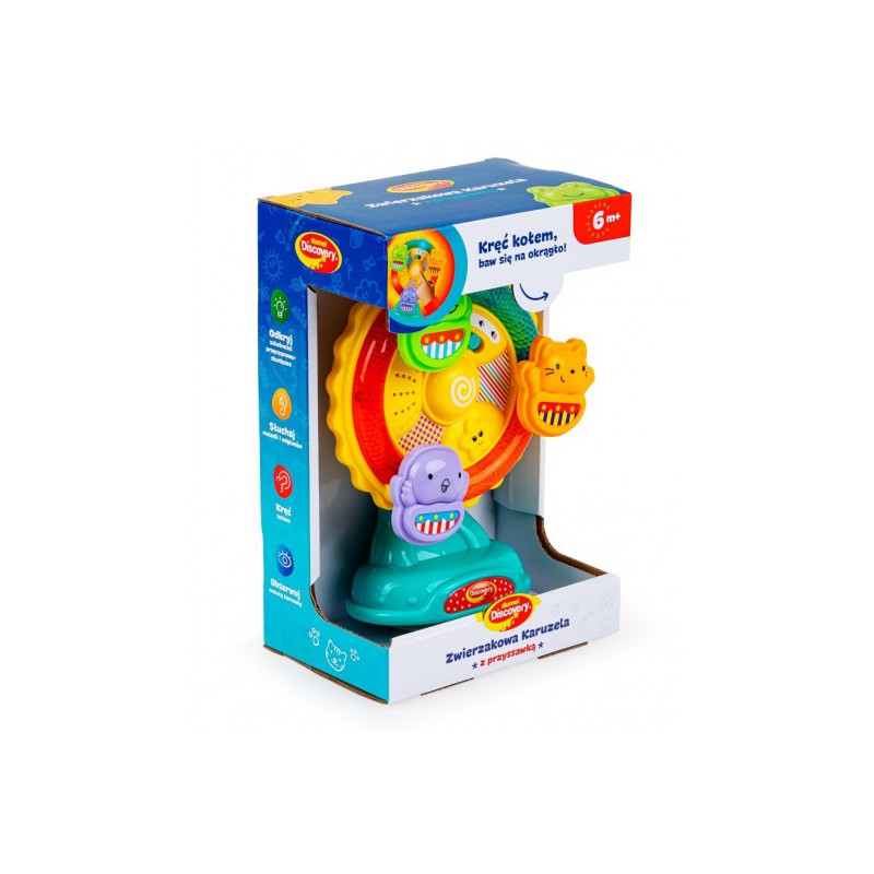 Karuzelka kryje w sobie odgłosy zwierząt, melodie i migające światełka, a dzięki praktycznej przyssawce, można ją przymocować do płaskiej, czystej i gładkiej powierzchni, aby nie przesuwała się w trakcie zabawy. Po naciśnięciu na każde ze zwierzątek, maluch usłyszy jego odgłos oraz melodię. Funkcja regulacji głośności umożliwia dostosowanie zabawki do indywidualnych potrzeb.