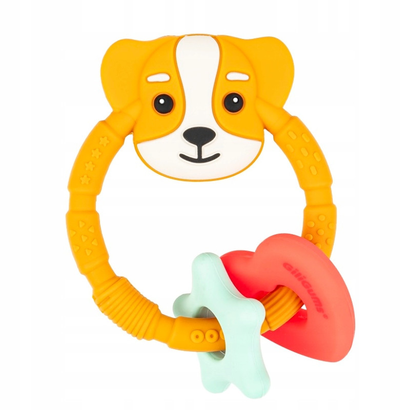 Śliczny gumowy gryzak, zabawka dla maluszków, który przyniesie ulgę podczas bolesnego ząbkowania. Zabawka jest w kształcie obręczy, pierścienia na którym znajduje się piesek, gwiazdka i serduszko.