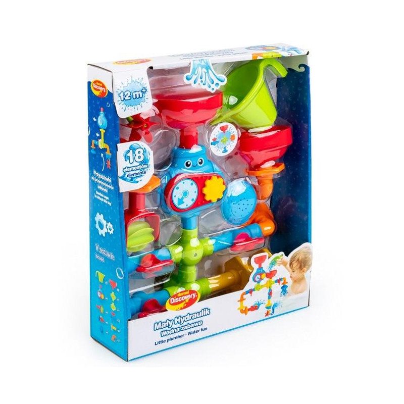 Super zestaw zawiera aż 18 elementów, które można ze sobą łączyć na różne sposoby, tak, aby zabawa się nie nudziła. Stwórz obieg dla wody, wlej ją dołączonym kubeczkiem do lejka , żeby przepłynęła przez kolorowy wodociąg, wprawiając w ruch elementy! Sprawdź jak woda tryska przez dziurki w słuchawce, obserwuj jak przepływając przez wiatraczek, obraca go dookoła. Poza walorem czysto rozrywkowym, zestaw także rozwija najmłodszych, zapewniając im twórcze zajęcie oraz ucząc odkrywania zależności przyczynowo - skutkowych. Do zabawki dołączone są przyssawki, dzięki którym można ją przymocować do gładkiej, czystej powierzchni, aby nie przesuwała się podczas korzystania z niej.