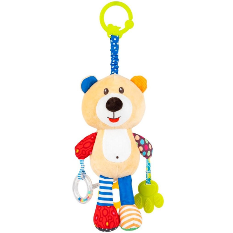 Kolorowa przywieszka, misiek w marynarskich kolorach zabawi malucha na wiele sposobów. Zabawka posiada grzechotkę i dwa miękkie gryzaki, które przyniosą ulgę obolałym dziąsłom ząbkującego bobasa. Jeden z gryzaków kwiatek, doszyty w miejscu misiowego ogonka, uruchamia dodatkowo melodię. Wystarczy go pociągnąć, a miś zagra słodką kołysankę. Nad głową pluszaka znajduje się materiałowa harmonijka, a po lekkim pociągnięciu zabawki, podciągnie się na niej z powrotem, delikatnie podskakując. Misiek został wykonana z materiałów o zróżnicowanych kolorach, wzorach i fakturach, dzięki czemu stymuluje on zmysły malucha, rozwijając przy tym jego zdolności poznawcze.