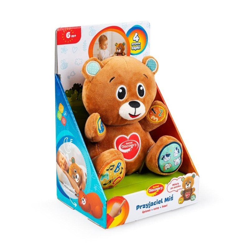 Każda z misiowych łapek aktywuje inne dźwięki, a drugie naciśnięcie tej samej łapki pozwala wyłączyć dźwięk, bez konieczności wysłuchania go do końca. Miś zna kołysanki, potrafi recytować wierszyki, śpiewa piosenki o literkach oraz kolorach, a także odtwarza odgłosy zwierząt wraz z melodią. Zabawka nie tylko więc bawi, ale też uczy, aktywizując malucha lub go wyciszając, w zależności od tego, którą łapkę wybierze.