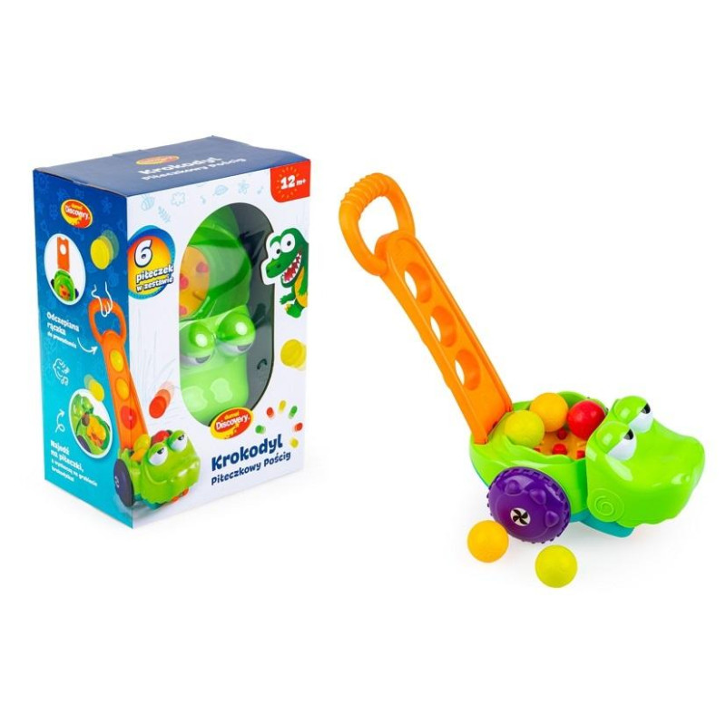 - 2 sposoby zabawy: dynamiczna (prowadź krokodylka za pomocą doczepianej rączki) lub statyczna (wyciągnij piłeczki z grzbietu i umieść je w otworach na rączce)