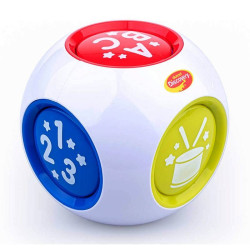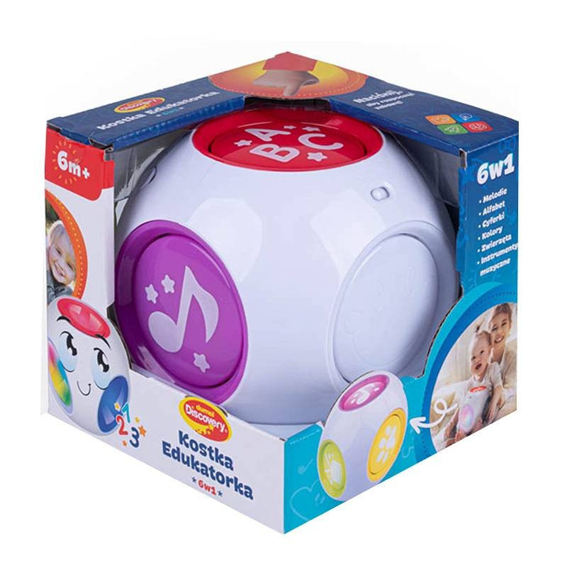 Edukacyjna, dotykowa kostka pełna dźwięków i kolorów zabawi na 6 różnych sposobów! Kryje ona w sobie dźwięki instrumentów muzycznych, odgłosy zwierząt, słowa w języku polskim: nazwy kolorów, literek i cyferek oraz wesołe melodie. Poszczególne dźwięki uruchamia się poprzez dotykanie kolorowych ścianek, na których znajdują się symbole odpowiadające trybom zabawy. Kostka posiada regulację głośności i wyłącznik dźwięku.