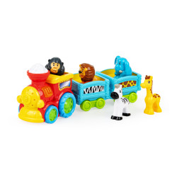 Interaktywna zabawka, która łączy ruch, melodie, kolorowe zwierzątka i naukę poprzez zabawę. Zestaw zawiera pięć figurek dzikich zwierząt, które można przewozić w wagonikach lub dopasowywać w formie sortera kształtów. Tego typu aktywność wspiera koordynację rąk i oczu, logiczne myślenie oraz pomaga rozwijać naturalną ciekawość dziecka. Po naciśnięciu przycisku pociąg zaczyna jechać do przodu, świeci kolorowym światełkiem i odtwarza odgłosy zwierząt oraz wesołą melodię. Maluch angażuje się w zabawę wszystkimi zmysłami, poznaje zależność przyczyna-skutek i uczy się poprzez działanie. Zabawka została stworzona z myślą o dzieciach od 12 miesięcy, dlatego elementy są większe, przyjazne i bezpieczne.
