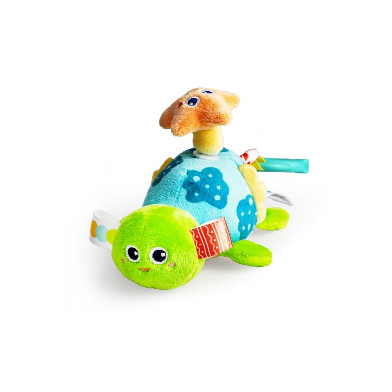 W tym uroczym zwierzątku kryje się dzwoneczek, który wydaje wesoły dźwięk przy potrząsaniu zabawką. Na grzbiecie znajduje się rozgwiazda, która zakręci się wesoło, gdy tylko pociągniesz za kółeczko z krabikiem przy zawieszce lub za, przyczepionego wcześniej, żółwika. Zwierzak podciągnie się na tasiemce z powrotem do góry, wesoło przy tym wibrując. Zabawka wykonana została z materiałów o zróżnicowanych fakturach.
