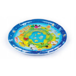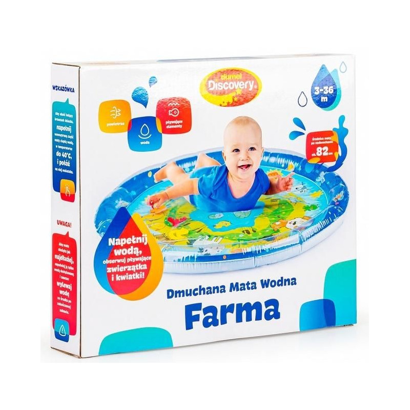 Duża mata wodna, która zapewni maluchowi wodną zabawę w falowanie i obserwowanie kolorowych kształtów, pływających w jej wnętrzu. Krawędź zawiera zawór do nadmuchania brzegu maty, natomiast spód maty wyposażony jest w zawór do napełniania wodą. Kiedy dziecko usiądzie, położy się na środku maty lub przyciśnie go rączką, woda zafaluje, wprawiając w ruch kolorowe kształty. Aby mata mogła służyć jak najdłużej, należy napełniać ją wyłącznie wodą destylowaną i pamiętać o tym, aby po zakończonej zabawie wylać wodę, pozostawiając matę do wyschnięcia.