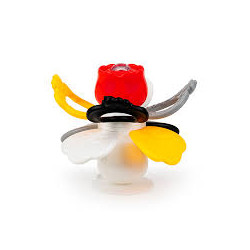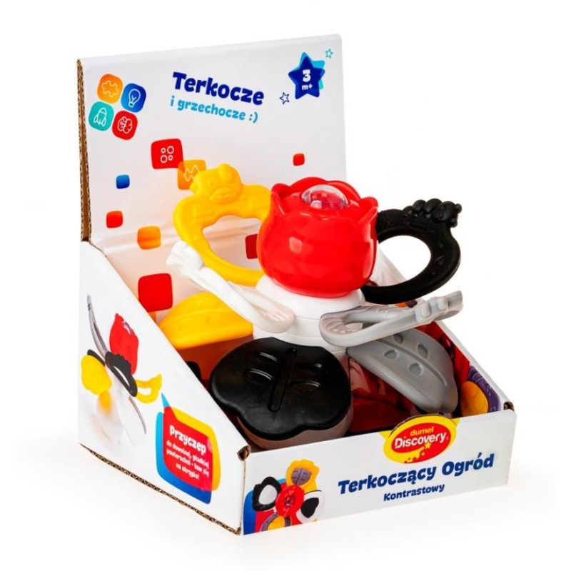 Terkoczący kontrastowy ogród zabawka składa się z miękkich oraz twardych gryzaków z różnymi wypustkami, kwiatka z ukrytą w jego wnętrzu grzechotką, z wesołego terkotka, którego aktywuje przekręcanie względem siebie górnych i dolnych gryzaków, oraz z praktycznej przyssawki. Dzięki niej przymocujesz zabaweczkę do dowolnej, czystej, płaskiej i gładkiej powierzchni, aby zajęła maluszka wesołym przekręcaniem i grzechotaniem w konkretnym miejscu.