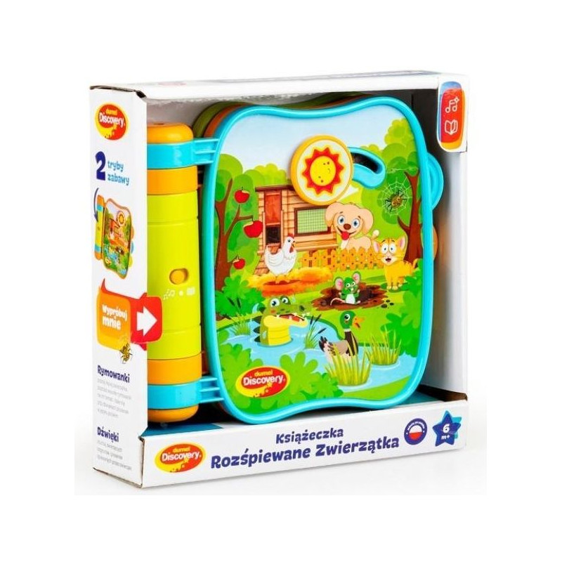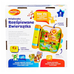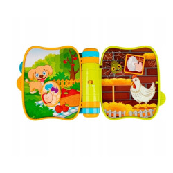 Kolorowa książeczka dla maluszków, która zapozna ze zwierzakami, poprzez piękne, kolorowe obrazki, wesołe wierszyki i zwierzęce odgłosy. Kryje ona w sobie dwa tryby zabawy, a za ich aktywowanie odpowiada przełącznik, znajdujący się na grzbiecie książki. Pierwszy tryb, to tryb dźwiękowy, w którym, poza odgłosami zwierzątek, maluszek może posłuchać piosenek śpiewanych przez zwierzaki. W drugim trybie, językowym, na najmłodszych czekają piosenki w języku polskim i rymowanki. Aby uruchomić powyższe funkcje, należy, zależnie od strony, przesunąć, przekręcić lub nacisnąć wystający, aktywny element. Na zewnętrznej stronie książeczki znajdują się kolorowe znaczniki z wypustkami, które ułatwią maluchom obracanie stron.
