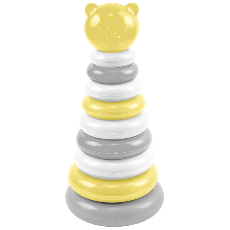 Piramidka w kolorze żółto – biało - szarym składa się z podstawy ze słupkiem, na który dziecko nakłada różnej wielkości kółka, w kolejności od największego do najmniejszego, na końcu nakłada ostatni element, główkę misia, która wieńczy całą budowlę. Dziecko podczas zabawy ćwiczy precyzyjne ruchy dłoni, koordynację ręka-oko niezbędną do wykonywania podstawowych czynności oraz do nauki pisania i rozwija zmysł logicznego myślenia. W trakcie zabawy piramidką dziecko uczy się rozpoznawania kolorów i rozróżniania wielkości (małe, mniejsze, najmniejsze). Na kolorowych kółkach wchodzących w skład zestawu maluch będzie mógł potrenować umiejętność chwytania, tę bardzo podstawową, ale arcyważną umiejętność, dzięki której będzie mógł samodzielnie wykonywać wiele czynności takich jak np. picie czy jedzenie. Zestaw wyróżnia się jakością wykonania, oryginalną kolorystyką oraz estetycznym wyglądem.