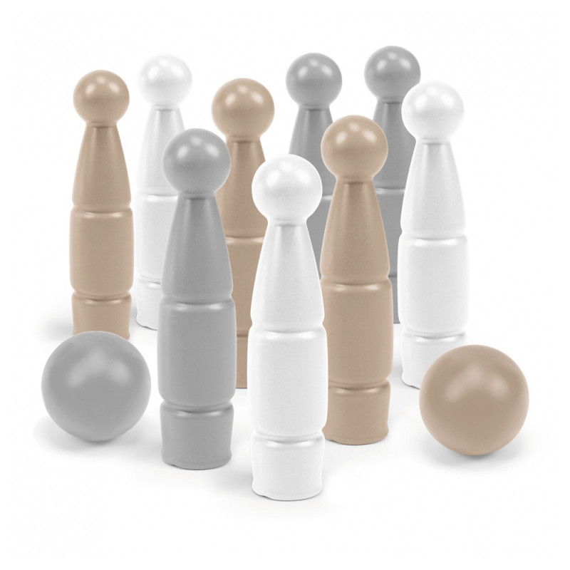 Zestaw do gry w kręgle w kolorach jasnego beżu, mlecznej szarości oraz bieli to fantastyczny sposób na wspólną zabawę. W zestawie znajduje się 9 różnokolorowych kręgli i 2 piłeczki. Całość jest starannie wykonana z bezpiecznych dla dzieci i trwałych materiałów. Gra w kręgle z serii Toys in Trends od Wader pobudzi wyobraźnię najmłodszych, rozwinie ich umiejętności motoryczne i manualne, precyzję ruchów, koordynację wzrokowo-ruchową i równowagę. Zabawa ma również pozytywny wpływ na myślenie przestrzenne i rozwija umiejętność oceny odległości, uczy również dyscypliny oraz koncentracji. Zapraszając do zabawy kolegów i koleżanki nasza pociecha już od najmłodszych lat będzie mogła integrować się z rówieśnikami rozwijając swoje kompetencje społeczne. Najmłodsi będą mogli nauczyć się zasad gry w kręgle opartych na uczciwej rywalizacji.