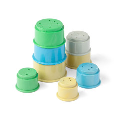 Osiem kubeczków edukacyjnych w wyjątkowych kolorach, różnej wielkości ze specjalnymi wgłębieniami, które ułatwiają nakładanie ich na siebie i ułożenie stabilnej wieży.