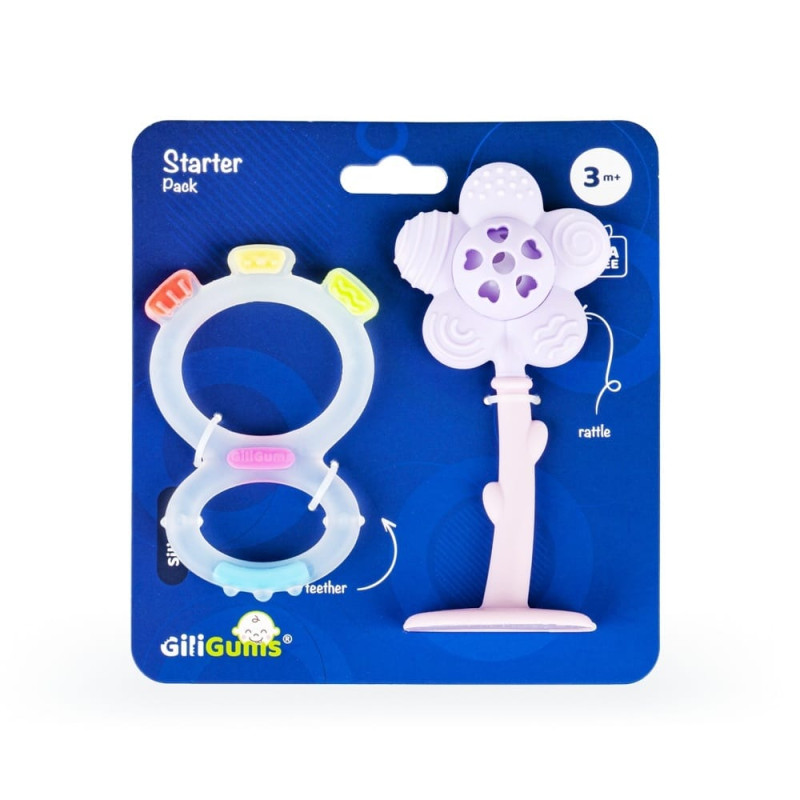Pierwszy zestaw dla maluszka składa się z dwóch praktycznych zabawek: gryzaka Ósemki oraz Radosnego Kwiatka w kolorze fioletowym. Zabawki posiadają wypustki, które podczas gryzienia będą delikatnie masować dziąsła bobasa, przynosząc mu tym samym ulgę w ząbkowaniu. Kształt gryzaka i grzechotki ułatwia małym rączkom chwytanie zabawek. Zestaw sprawdzi się świetnie w charakterze prezentu.
