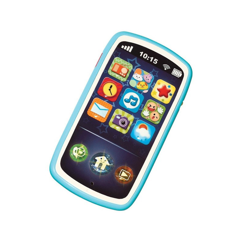Smartfon Smily firmy Smily Play. Telefon zaprojektowany specjalnie dla najmłodszych. Wyposażony jest w 12 przycisków przypominających aplikacje po naciśnięciu których uruchamiają się piosenki, dźwięki oraz efekty świetlne. Maluch może dodatkowo nagrać sój głos a p[otem go odtworzyć.
