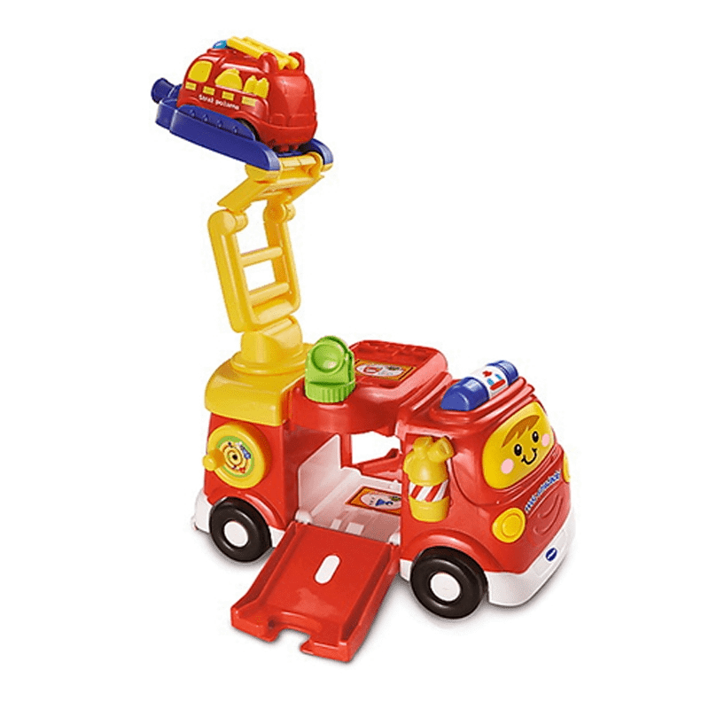 Tut tut Wóz strażacki firmy V-tech. Samochód wyposażonych w światła i dźwięki oraz frazy w języku polskim. Duży wóz strażacki z ruchomymi elementami oraz małym wozem. Zestaw można łączyć z innymi z serii.