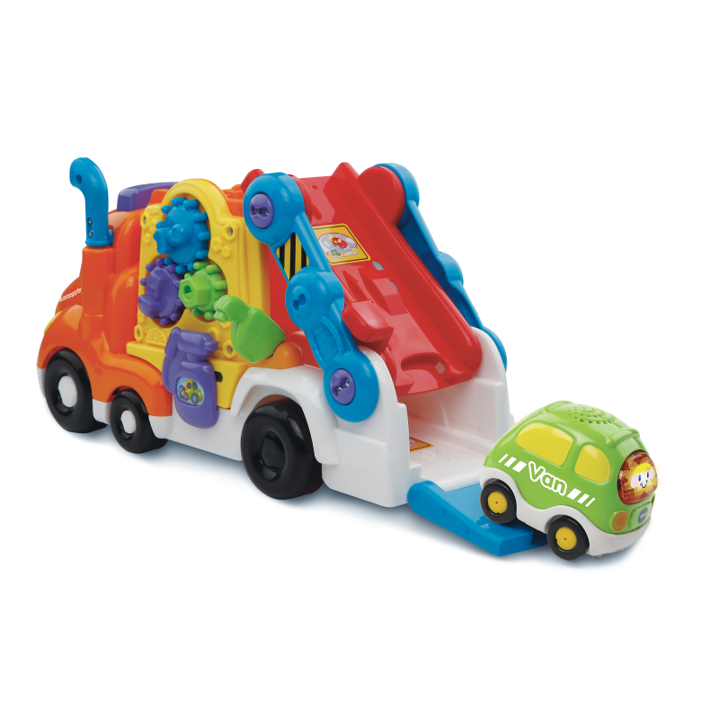 Tut tut Autotransporter firmy V-tech. Samochód wyposażonych w światła i dźwięki oraz frazy w języku polskim. Duży transporter z ruchomymi elementami pomieści aż 4 autka. W zestawie z Autkiem Van. Zestaw można łączyć z innymi z serii.