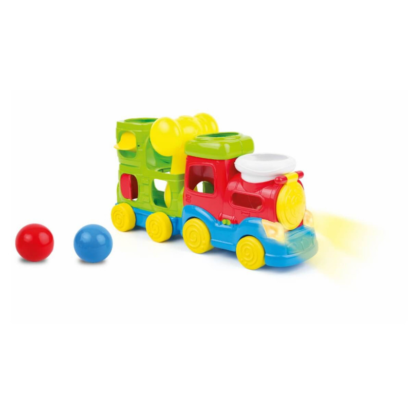 Pociąg Stuku Puku z serii Smily Play. Kolorowy pociąg miga światełkami, gra wesołe melodie i wydaje dźwięki. Dzięki kolorowym piłeczkom, które dziecko wbija przy pomocy młotka może poznać kolory. Wiek 18 miesięcy+