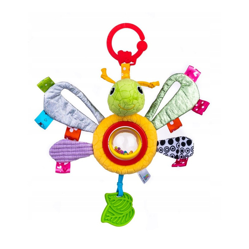 Lulu to idealny towarzysz zabaw! Posiada kolorowe skrzydełka ozdobione metkami o zróżnicowanej fakturze. Dodatkowo, każde ze skrzydełek wykonane jest z innego materiału i różni się kolorem, aby jeszcze bardziej stymulować zmysł wzorku i dotyku maluszka. W brzuszku Lulu kryje się obrotowa kulka wypełniona grzechoczącymi koralikami, które rozweselą bobaska. Doczepiony do zawieszki gryzaczek przyniesie ulgę obolałym dziąsełkom ząbkującego malucha. Praktyczna klamra pozwoli przyczepić zabawkę w dowolnym miejscu.