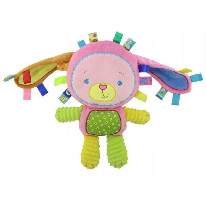Przyjemna w dotyku przytulanka z piszczkiem, grzechotką i kolorowymi wypustkami, które mają wpływ na integracje sensoryczną u maluchów. Pluszak (35 cm) ma w brzuszku grzechotkę i piszczek, a żywe kolory i różnorodność faktur tkaniny dostarczają maluchowi wrażenia podczas dotyku. Wiek 0m+