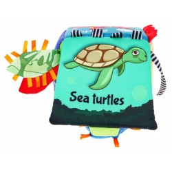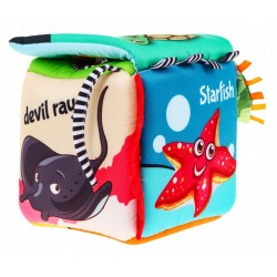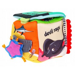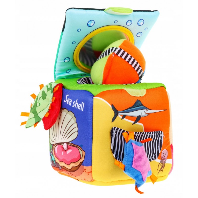 Miękka, sensoryczna kostka z kolorowymi obrazkami, otwierana zakładka z bezpiecznym lusterkiem, kieszonka z piłeczką, kieszonka z gwiazdką, element sensoryczny, elementy z dzwoneczkami,