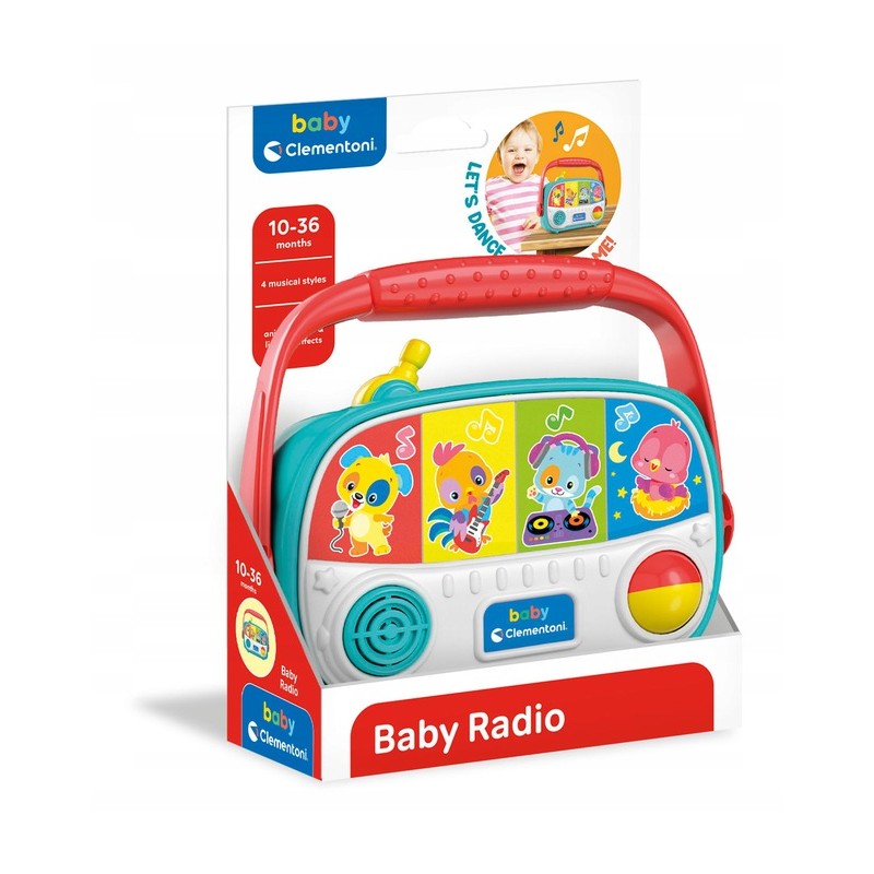 Baby radio z 4 przyciskami wyboru stylu muzycznego, aby rozwijać słuch. Efekty świetlne. Po naciśnięciu przyciski włączają różne melodie i wydają odgłosy zwierząt. Żywe kolory przyciągają wzrok dziecka. Zabawka stymuluje rozwój zmysłów, rozwój poznawczy, zachęca dziecko do interaktywnej zabawy. Baterie 2x AA.