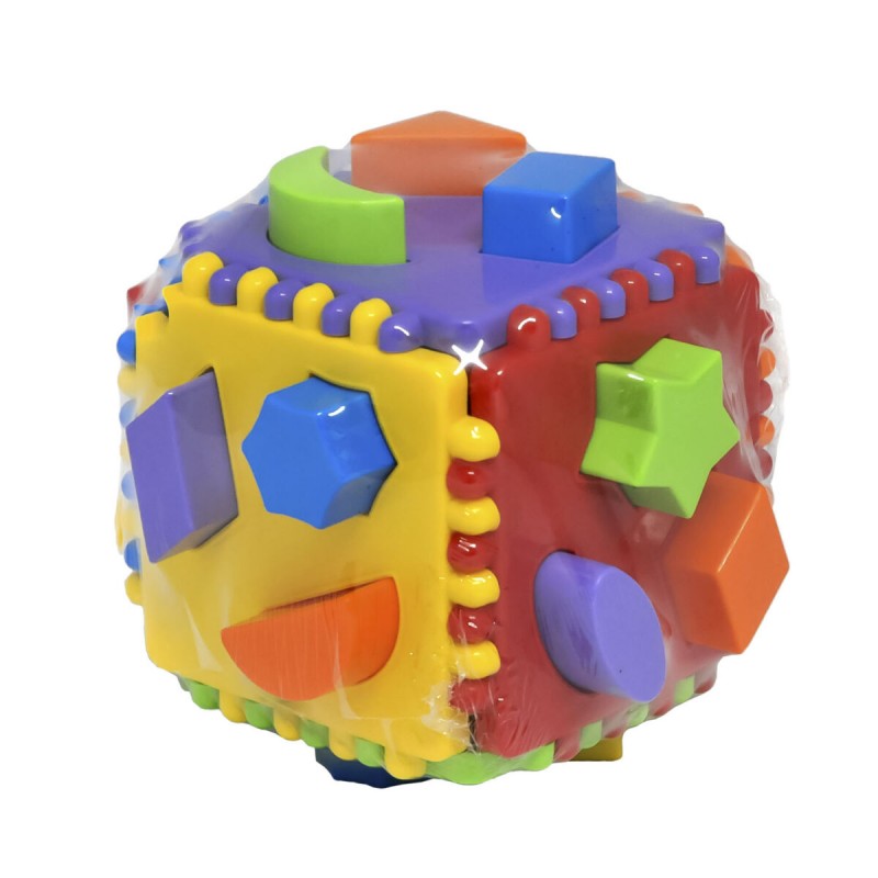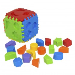 Zabawka składa się z 6 ścian z zamkniętymi otworami o różnych kształtach oraz 18 wielokolorowych klocków o geometrycznych formach. Aby ułożyć kostkę, dziecko musi połączyć ściany, które składają się z 6 wielokolorowych elementów. Dodatkowo w każdej ściance kostki znajdują się 3 otwory, do których należy włożyć klocek o odpowiednim kształcie. Wybierając figury do otworów, dziecko bada kształty i kolory, uczy się porównywać i analizować, rozwija pamięć i logikę. Zabawka stymuluje rozwój zmysłów i wyobraźni. Wiek 1+.