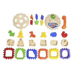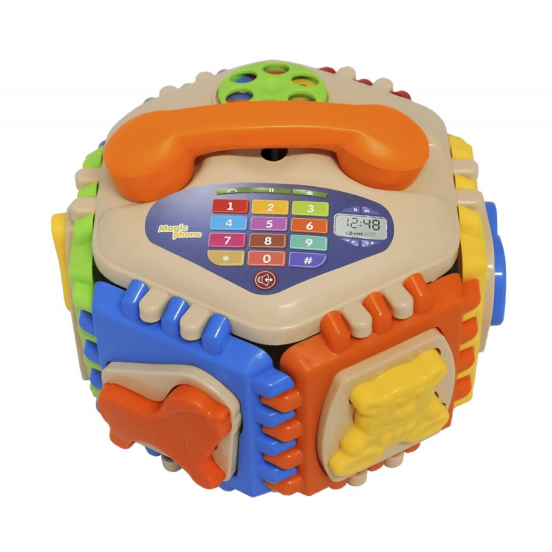 Sorter ” Magiczny telefon” 27 el. Zabawka składa się z 6 boków z figurami o różnych kształtach, w które wstawione są postacie zwierząt. Spód zabawki to sorter z otworami do którego dołączonych jest sześć geometrycznych klocków, góra zabawki to zabawkowy telefon wyposażony w słuchawkę telefoniczną i tarczę.