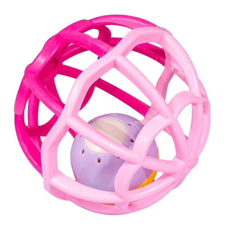Miękka piłka w kolorze różowym, w której wnętrzu znajduje się jeszcze jedna piłeczka. Piłka pełni funkcję grzechotki.
