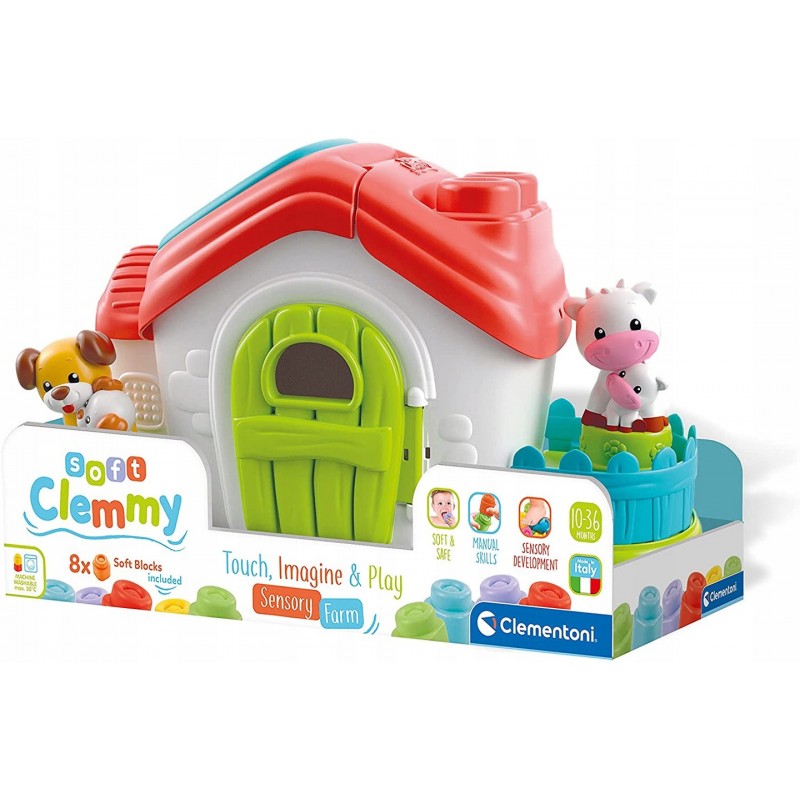 Nowy zestaw farma, który jednocześnie jest wiaderkiem Clemmy. Różne materiały i tekstury, aby dziecko mogło się bawić umieszczając i wyjmując miękkie postacie zwierząt i klocki.