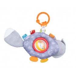 W jego brzuszku kryje się kula wypełniona grzechoczącymi koralikami, a jego grzbiet zdobią kolorowe metki o zróżnicowanych fakturach.