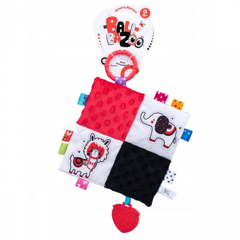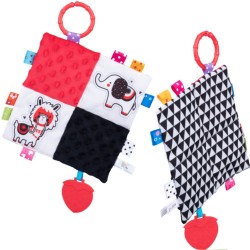 Wykonany ze zróżnicowanych materiałów kocyk szeleści podczas zgniatania, a zdobią go kolorowe metki o różnych fakturach.