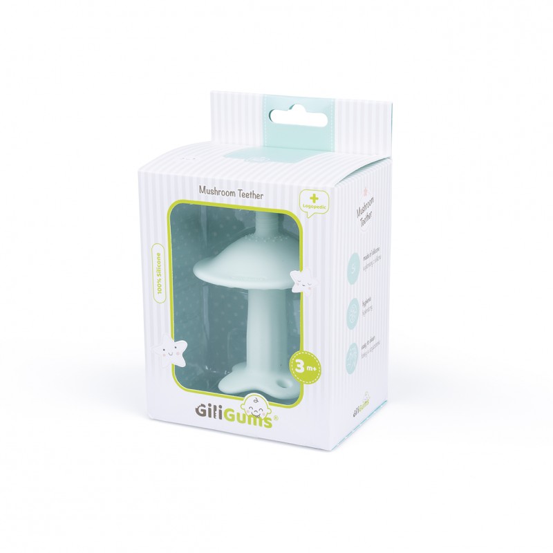 Sensoryczny, silikonowy gryzak - grzybek umili okres ząbkowania i wyciszy maluszka. Unikatowy kształt gryzaka, imitujący pierś matki, uspokaja dziecko, zapewniając mu poczucie bezpieczeństwa. Dodatkowo, gryzak pełni funkcję profilaktyki logopedycznej, gdyż korzystanie z niego wzmacnia mięśnie ust i sprawność aparatu gryząco-żującego. Grzybek ozdobiony jest wypustkami, które delikatnie masują dziąsła dziecka.