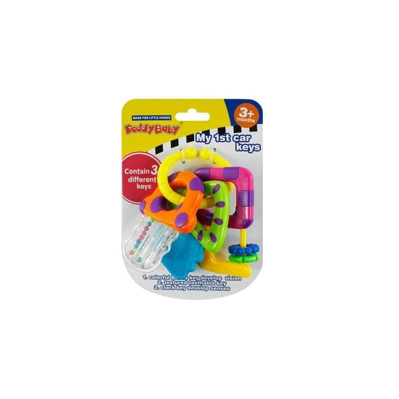 Grzechotka, która zaciekawi każdego maluszka. Kolorowe kluczyki przyciągną wzrok, a różnorodne faktury oraz kształty zachęcą do zabawy. Dziecko rozwinie zmysł dotyku, wzroku, umiejętności manualne oraz umiejętność chwytania. Gumowy kluczyk z powodzeniem zastąpi gryzaczek i ukoi bolące dziąsełka.