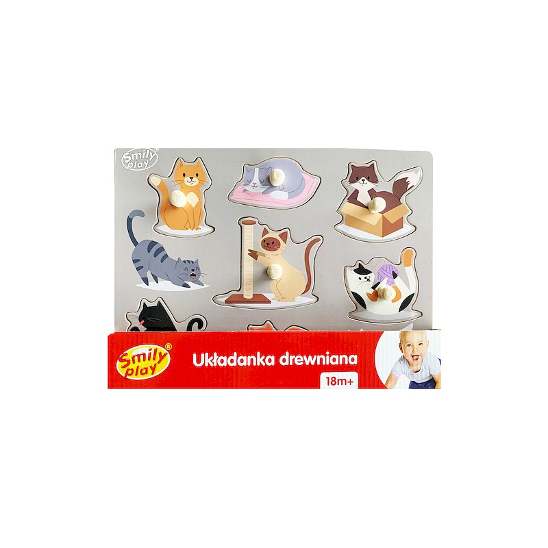 Drewniane puzzle można układać w specjalnie wyprofilowanych miejscach na przystosowanej do tego tablicy. Każdy element układanki posiada uchwyt, dzięki któremu dziecku łatwiej będzie układać puzzle. Układanka składa się z puzzli i tablicy. Każdy element tablicy jest w innym kształcie i kolorze – puzzle prezentują kotki a tablica jest dla nich tłem i dopełnieniem obrazu.