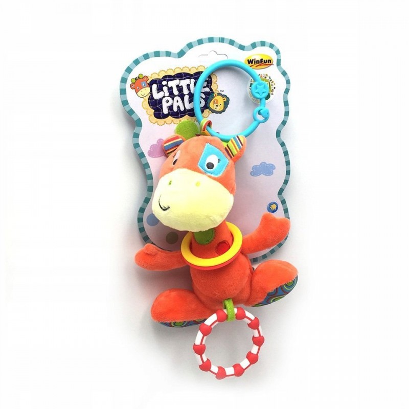 Kolorowa, grzechocząca zawieszka. Przedstawia wesołą Żyrafkę. Wykonano ją z doskonałych materiałów dzięki czemu jest mięciutka bardzo kolorowa i przyjemna w dotyku. Posiada duży uchwyt mocujący służący do zwieszenia zabawki. Dziecko, potrząsając zwierzątkiem usłyszy delikatny odgłos dzwoneczka. Dodatkowo zawieszka posiada szeleszczące uszy oraz ruchome elementy doskonale stymulujące małą motorykę dziecka.