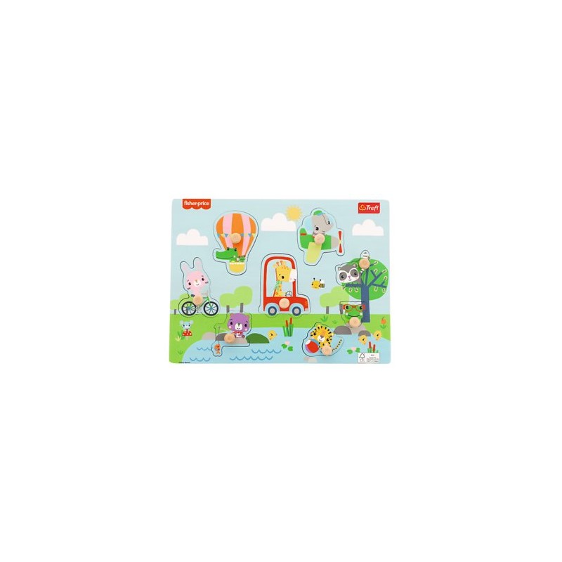 Puzzle drewniane z kolorową grafiką. Podstawka z wyżłobieniami oraz 8 wyjmowanych elementów z uchwytem. Zadaniem dziecka jest dopasowanie puzzli w odpowiednie miejsce na podstawce- zadanie ułatwi grafika znajdująca się na wyżłobieniach- taka sama jak na puzzlu z tym, że czarno-biała. Zabawka wspomaga ćwiczenie motoryki małej dziecka oraz dopasowywania kształtów. Drewniane puzzle są solidne i łatwe do chwytania.