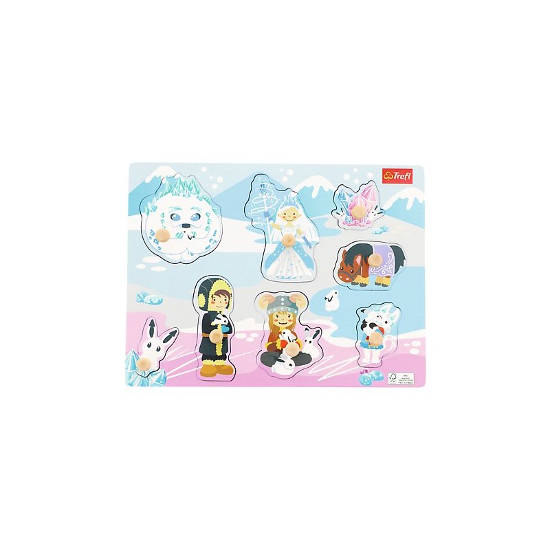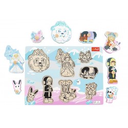 Puzzle drewniane z kolorową grafiką. Podstawka z wyżłobieniami oraz 8 wyjmowanych elementów z uchwytem. Zadaniem dziecka jest dopasowanie puzzli w odpowiednie miejsce na podstawce- zadanie ułatwi grafika znajdująca się na wyżłobieniach- taka sama jak na puzzlu z tym, że czarno-biała. Zabawka wspomaga ćwiczenie motoryki małej dziecka oraz dopasowywania kształtów. Drewniane puzzle są solidne i łatwe do chwytania.