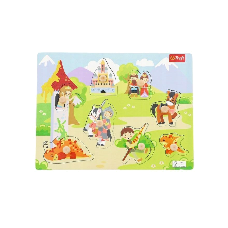 Puzzle drewniane z kolorową grafiką. Podstawka z wyżłobieniami oraz 8 wyjmowanych elementów z uchwytem. Zadaniem dziecka jest dopasowanie puzzli w odpowiednie miejsce na podstawce- zadanie ułatwi grafika znajdująca się na wyżłobieniach- taka sama jak na puzzlu z tym, że czarno-biała. Zabawka wspomaga ćwiczenie motoryki małej dziecka oraz dopasowywania kształtów. Drewniane puzzle są solidne i łatwe do chwytania.