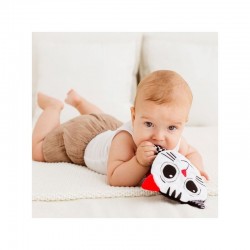 Wesoły kiciuś uroczo szeleści i czaruje wyrazistymi kolorami, stymulując zmysły najmłodszych. Dzięki niewielkiemu rozmiarowi zabawka sprawdzi się idealnie w podróży. Zwierzak został wykonany z materiałów różniących się fakturą, przez co, podczas dotykania pluszaka, maluch ma do czynienia z różnymi bodźcami dotykowymi, co wpływa korzystnie na rozwój jego zdolności poznawczych. Zabawkę zdobi czerwonych gryzak z wypustkami, który z pewnością przyda się podczas ząbkowania.