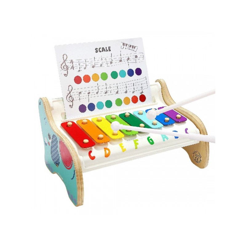 8-tonowe cymbałki z drewnianym słonikiem. Każda z płytek ma inny kolor, dzięki czemu dziecko łatwiej nauczy się odróżniać dźwięki i tony. Do zestawu dołączono plansze z popularnymi kołysankami i piosenkami dziecięcymi, posiadające odpowiednie oznaczenia kolorystyczne. Dzięki temu dziecko oprócz tworzenia własnych melodii może zagrać znane mu utwory.