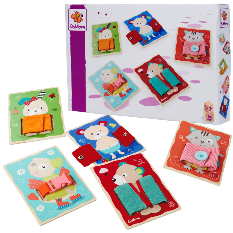 Zestaw składa się z 5 kolorowych tabliczek z różnymi zwierzętami. Każde z nich posiada nakrycie, które trzeba zapiąć w różny sposób. Układanka dobrze wpłynie na rozwój dzieciaków ich umiejętności, rozpoznawania zwierząt oraz koordynacji oko - ręka. Zabawka została wykonana z wysokiej jakości drewna.