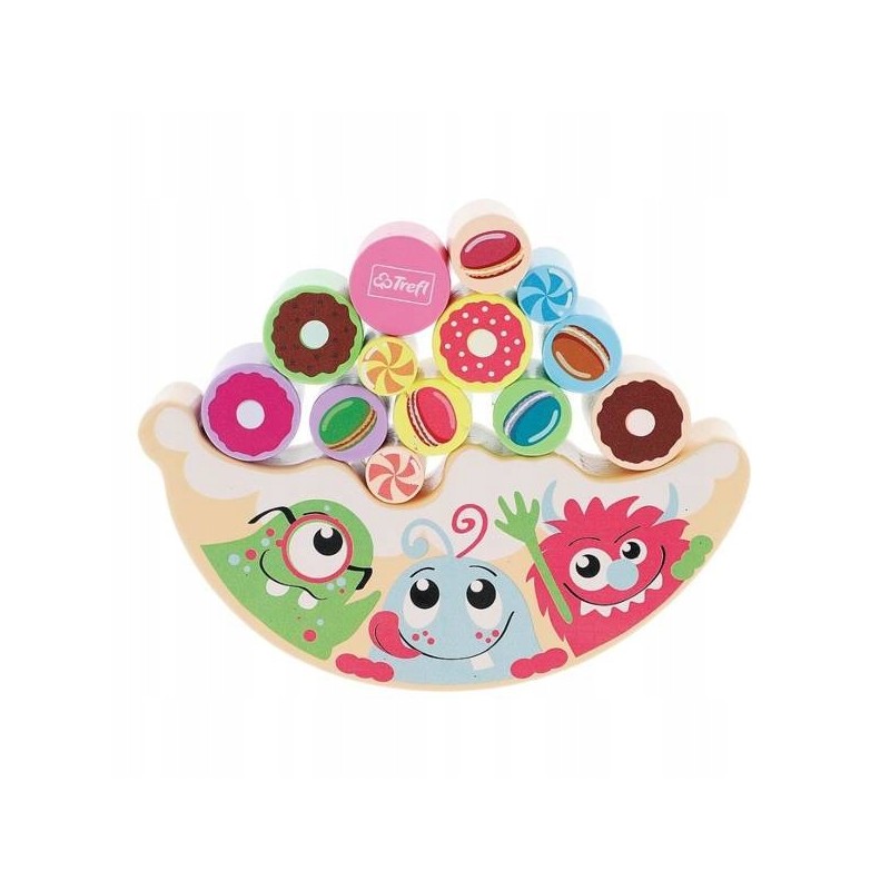 Zabawka jest drewniana, wykonana z naturalnego drewna, atestowana. Zabawa polega na ułożeniu nad głowami ciasteczkowych potworków jak największej ilości łakoci przy jednoczesnym zachowaniu równowagi całej konstrukcji. Uczy pojęcia równowagi, cierpliwości, rozwija koordynację wzrokowo-ruchową, refleks, uczy koncentracji, ćwiczy motorykę małych paluszków oraz wzmacnia odruch chwytania, dostosowana do małych rączek.