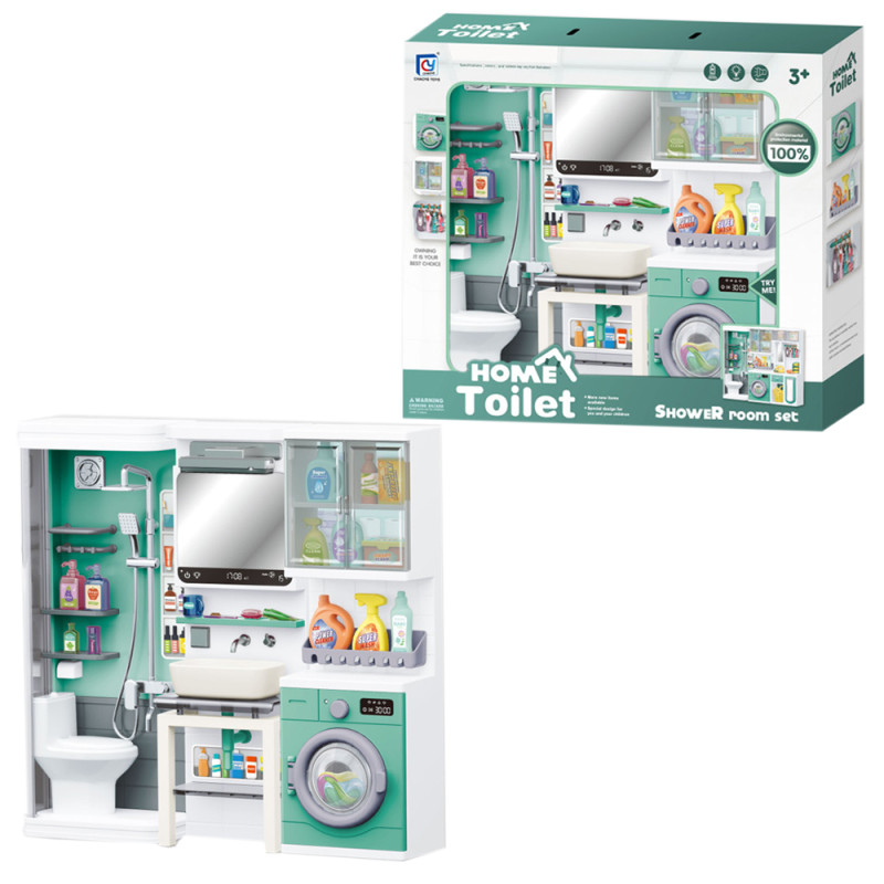 Zestaw mebli łazienkowych - składa się z elementu z pralką, drugiego z umywalką i trzeciego z toaletą i prysznicem. W komplecie znajdują się również : akcesoria łazienkowe i górne szafki.