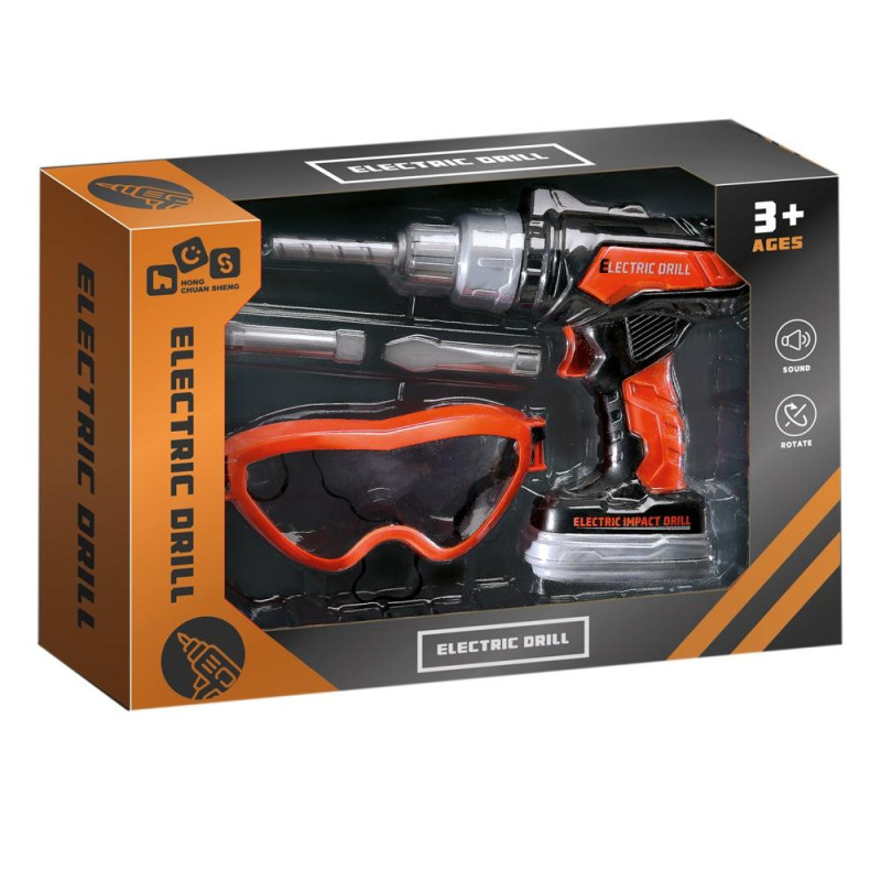 Wiertarko-wkrętarka na baterie z różnymi końcówkami oraz okularami ochronnymi.